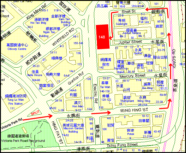 (Translates to: 148 Electric Road, North Point, Hong Kong) Parking Lot Directions: You can park your car in the parking lot directly inside the building via the rear entrance. You need to be going northbound on King's Road to make a left into Shell Street which leads to the parking lot. The street sign for Shell Street is constructed on the wrong side of the street and can easily be missed while driving. There is a building on the corner of Shell Street that says Sing Pao Building. You can use that as an indicator as to when to make the turn. Please refer to the map below and note the red arrows.